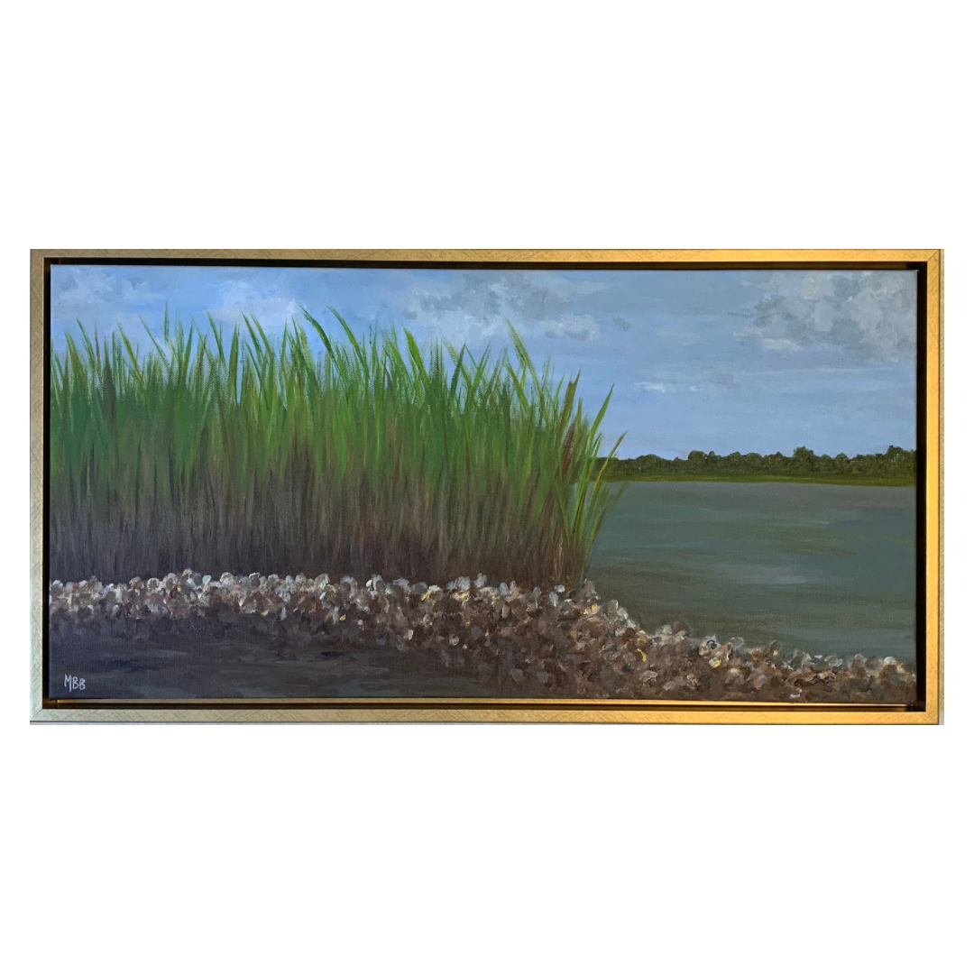 Acrylic painting of an oyster bed and marsh grasses in the lowcountry. Varnished for protection and framed in a custom gold floater frame.